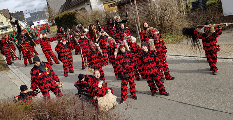 Unser Häs besteht aus ca. 2000 roten und schwarzen ziegelförmigen Filzflecken, die einzeln in Wellenform aufgenäht werden. Diese Wellenform symbolisiert die durch unseren Ort fließende Eschach.